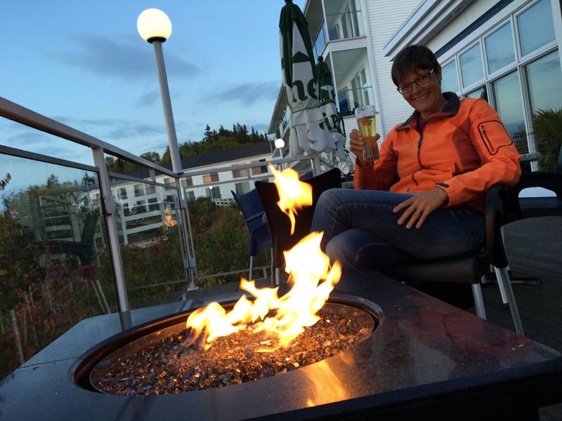 Gegen Abend erreichen wir Rivière-du-Loupe,wo wir in der L’Auberge de Rivière-du-Loupe einchecken. Auf der Terrasse der Hotelbar genießen wir einen Sundowner mit Blick auf den Fluss.
