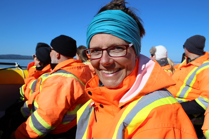 Nach ca. zwei Stunden machen wir uns auf den Weg zum Hafen von Baie St. Catherine. Dort bekommen wir von AML unsere Ausrüstung (wasserfeste Hosen und Jacken) und danach gehen wir an Board unseres Zodiacs. Das Boot hat nur die Form eines Zodiacs, aber es besteht zur Gänze aus Eisen und hat ungefähr 50 Plätze. Wir holen noch weitere Passagiere in Tadoussac ab und dann fahren wir mit voller Geschwindigkeit am St. Lorenz Strom nach Osten. Der Wind bläst uns eiskalt ins Gesicht. Zum Glück haben wir uns sehr warm angezogen.