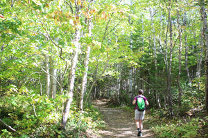 Vom Petit-Gaspé-Beach führt ein schöner Rundwanderweg auf den Mont-Saint-Alban. Oben ist eine Aussichtsplattform errichtet, die einen 360°-Blick ermöglicht. Wir sind in einer knappen Stunde oben, genießen die Aussicht, machen Fotos und setzen dann die Runde fort. Ein Stück unterhalb des Gipfels machen wir an einem Aussichtspunkt unsere Mittagsrast. Die Jause schmeckt vorzüglich. Der zweite Teil des Rundwegs ist nur mäßig steil und wir gehen gemütlich durch den Wald. Die Bäume färben gerade um, und die Farben sind sehr intensiv. Wieder zurück am Parkplatz setzen wir uns noch kurz an den Strand und beobachten einen Seehund, der aus dem Wasser schaut, wenn die Steine am Strand von den Schritten der Besucher rascheln.