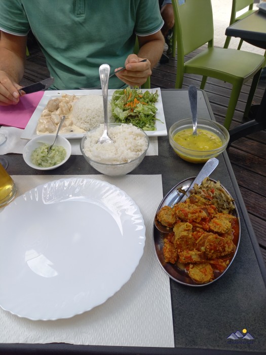 Als wir bim Auto retour sind, ist es bereits Mittag. Da es hier oben aber keine Verpflegung gibt, fahren wir die enge Bergstraße 24 km retour nach Bourg-Murat und suchen uns dort ein Restaurant. Im „La Kaz“ kehren wir ein. Wolfgang isst ein Rougail Boeuf et Carot und ich eine kleine Schweinsstelze. Es schmeckt wie immer auf Réunion herrlich. Diesmal gibt’s zum vielen Reis ein Bohnenragout und Piment mit Tomaten und Zwiebeln. Gegen 14:30 Uhr fahren wir wieder den Berg hinauf zum Parkplatz Foc Foc. Mit leichterem Gepäck als am Morgen machen wir uns wieder auf den bereits bekannten Weg zum Piton de Bert.