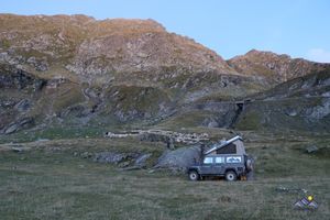 Ein paar Kehren unter dem höchsten Punkt finden wir einen Stellplatz. In der Nähe ist ein Unterstand eines Schafhirten, der am Abend mit seiner Herde dorthin zurückkehrt. Seine Hunde besuchen uns und legen sich neben unser Auto. Zu fressen bekommen sie bei uns allerdings nichts. Wir bauen das Vorzelt auf und backen einen Zwetschkenkuchen.
