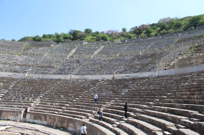 Das große Theater, dessen Alter nicht genau datiert werden kann, verfügte über 25.000 Sitzplätze. Auch heute ist die Akustik noch sehr gut und wir versuchen uns in Shakespeare und Monty Python. Da außer uns nur ein paar Asiaten hier sind, haben wir die Bühne ganz für uns.