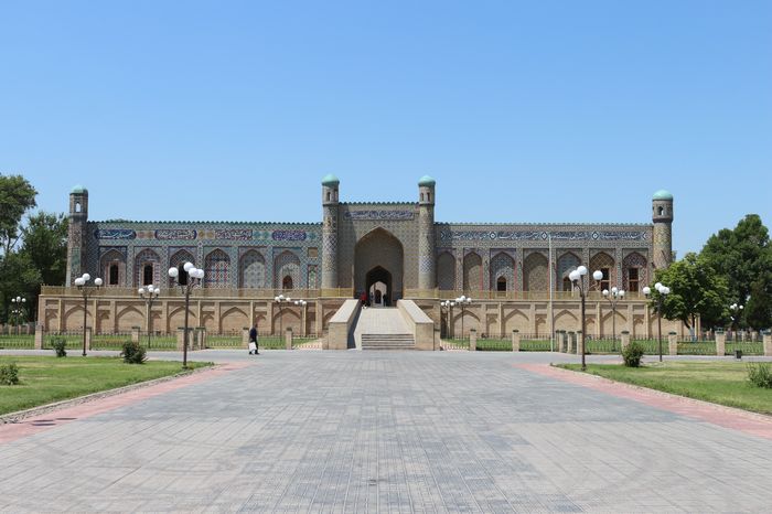 Unser erstes Ziel ist der Ort Kokand, wo wir uns gleich nach unserer Ankunft auf einen Stadtrundgang begeben, denn wir wollen die bunte Fassade des Chan Palastes sehen. Leider haben wir abends starkes Gegenlicht und so bummeln wir weiter bis zur Jamee Moschee. Diese ist klein, aber mit ihrer aufwändig bemalten Holzdecke durchaus sehenswert. Kokand ist ein netter, verschlafener Ort, der schon ein wenig russisches Flair verstreut.