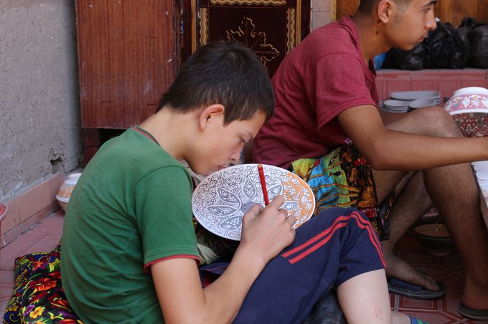 Wir werden äußerst freundlich vom Firmenchef und seinem Vater begrüßt. Der Vater spricht nur usbekisch und russisch. Der Firmenchef erklärt uns seine Werkstatt und seine Arbeit in einem bunten Sprachenmix (deutsch, spanisch, russisch, englisch, …). Wir sehen wie die Keramiken getöpfert, gebrannt, bemalt und anschließend wieder gebrannt werden. Hier passiert alles noch in Handarbeit. In einem der schönen Innenhöfe sitzen zwei Burschen und bemalen die Keramiken mit traditionellen bunten Motiven. Nach der Führung bekommen wir selbstgemachten Kirschensaft serviert und unterhalten uns sehr angeregt mit Said. In einer Ecke seines Ausstellungsraums hat er auf großen Keramiktellern verschiedene Landestrachten aus verschiedenen Ländern ausgestellt. Es gibt ein Teller zu Österreich, es zeigt eine Oberösterreichische Tracht – wir sind begeistert.