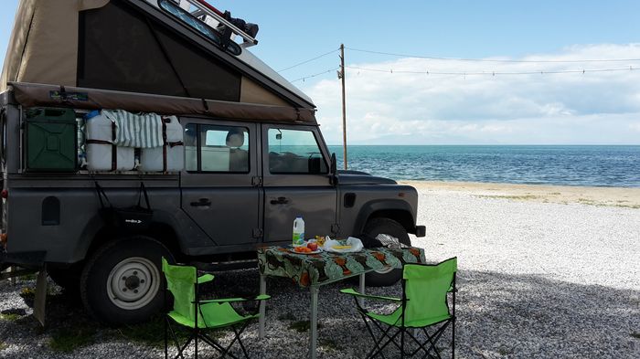 Kurz vor Tatvan überholen wir einen grünen Deutschen VW-Bus mit Fahrrad hinten drauf. Den haben wir auf dem Weg nach Kappadokien schon mal getroffen. Wir hupen und winken uns kurz zu, dann biegen wir nach Tatvan ab, während der VW-Bus weiterfährt. Heute gönnen wir uns ein Hotel, denn die Campingplatzdichte nimmt ab, je weiter wir nach Osten kommen. Da die Temperaturen und das Wetter sehr bescheiden sind, können wir auch unsere Solardusche nicht verwenden. Bevor wir jedoch im Tasar Royal Hotel einchecken, fahren wir an den Van See und suchen uns ein Picknick Plätzchen, wo wir noch einen Teil unseres Schweinefleisch-Vorrats vertilgen (Kaminwurzerl und Prsut), samt Schaf- Kuh-Ziegenkäse, Tomaten, Gurke und Oliven. Es bläst ein eisiger Wind und wir sind froh, als wir wieder im Auto sitzen.