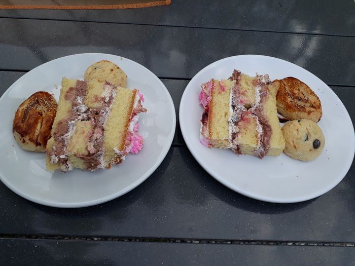 Etwas verärgert verlassen wir den Parkplatz und Wolfgang parkt an der Hauptstraße in zweiter Spur, während ich noch schnell in einen Supermarkt gehe und Zutaten für einen Nudelsalat und etwas Obst einkaufe. Der Supermarkt-Chef ist grad beim Frühstück mit seiner Familie und hätte mich dazu eingeladen. Das wäre mit Sichheit besser gewesen, als das Hotelfrühstück.