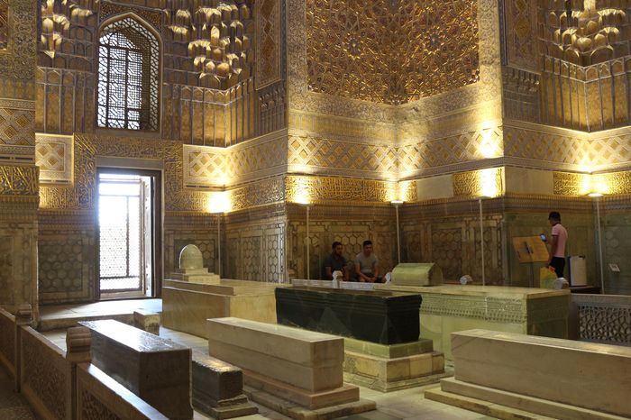 Um Gur Emir (das Grab des Gebieters) zu besichtigen, ist es ratsam erst am späten Nachmittag dorthin aufzubrechen, wenn das Gebäude in der Abendsonne glänzt. Hier wurde im 14. Jahrhundert die Grabstätte der Timuriden errichtet. Auch Tamerlans (auch bekannt unter Timur Lenk) Grab befindet sich hier. Es ist von außen und von innen prachtvoll. Der Sarg Tamerlans sticht mit dem fast schwarzen Nephrit hervor. Die Wände sind über und über verziert mit goldenen Mustern.