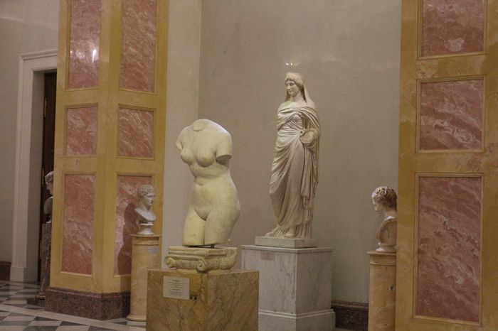 Wir beginnen mit der Eremitage, einem weitläufigen Museum, das sich Großteils in den Räumlichkeiten des Winterpalastes der Zaren befindet. Wir kaufen die Tickets online, da wir von langen Warteschlangen vor den Ticketschaltern gelesen haben. Mit unseren e-Vouchern auf dem Handy gehen wir zum Nebeneingang. Hier ist es ausgesprochen ruhig, keine Warteschlangen, nichts. Vielleicht ist es deshalb so ruhig, da am nächsten Tag, dem ersten Donnerstag des Monats, gratis Eintritt für alle ist, und viele Besucher daher erst morgen die Eremitage besuchen. Wir tauschen den Voucher gegen Tickets ein und nehmen einen Audioguide.