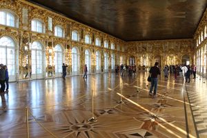Leider wurde der Palast im zweiten Weltkrieg fast komplett zerstört. So sind die Deckengemälde und Parkettböden fast alle neu, auch wenn sie nach alten Fotografien reproduziert wurden. Nichts desto trotz ist es atemberaubend. Das viele Gold blendet uns richtig. Da tut die eher schummrige Atmosphäre im Bernsteinzimmer wirklich gut. Auch das ist nicht mehr das Original. Dieses wurde von den Nazis gestohlen und gilt seither als verschollen. Lediglich eine Kommode und ein Mosaikbild wurden von Deutschland retourniert.